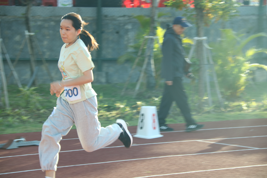 比赛开始前,罗芯雨做好热身准备,站在第5个跑道上蓄势待发。发令枪声一响,她昂首挺胸,带着心中必胜的信念,如矫兔般飞离起点,加速、追逐,向终点飞奔而去。在观众们的加油助威声中,罗芯雨奋力冲刺,尽显公司高昂的运动斗志和精神。