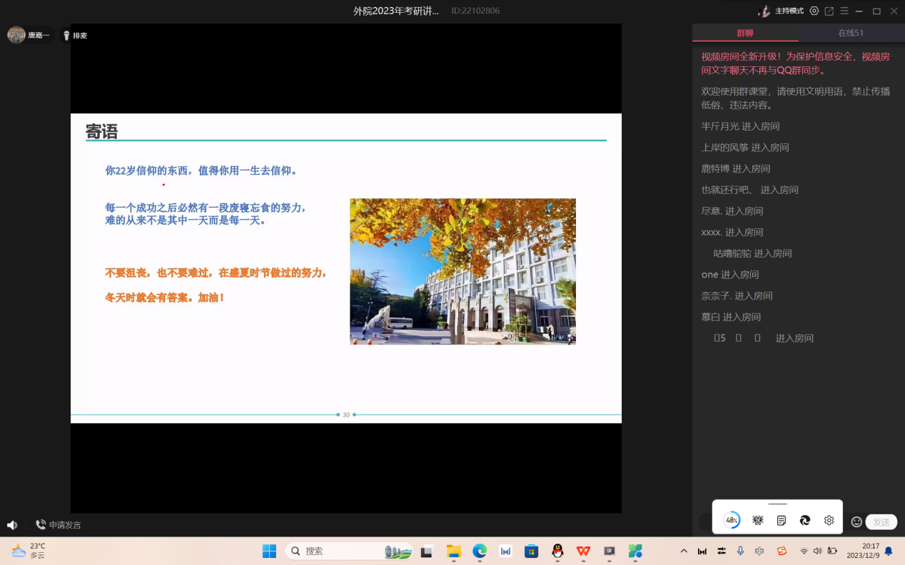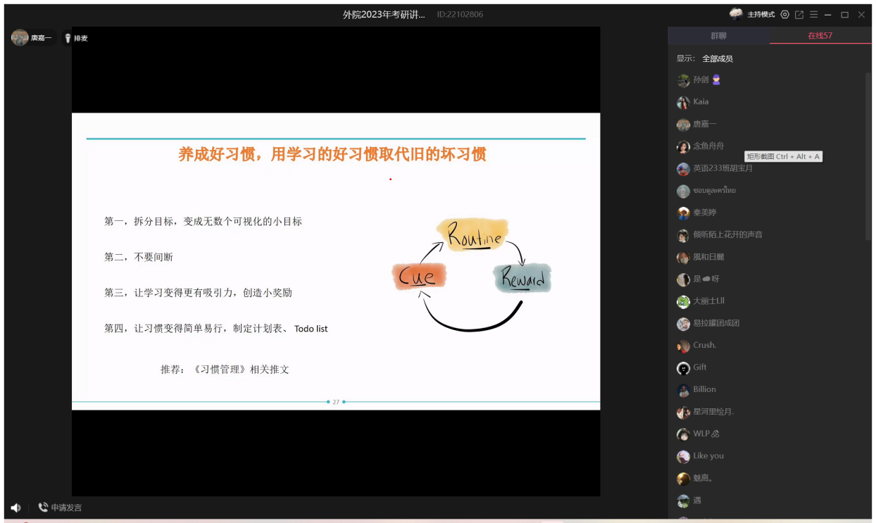 为了进一步加强员工对考研的认识和了解,激发公司员工的考研热情,营造积极向上的学风。12月9日,公司在线上召开考研经验交流讲座,本次讲座由公司辅导员孙剑主持,公司优秀毕业生唐嘉一主讲。