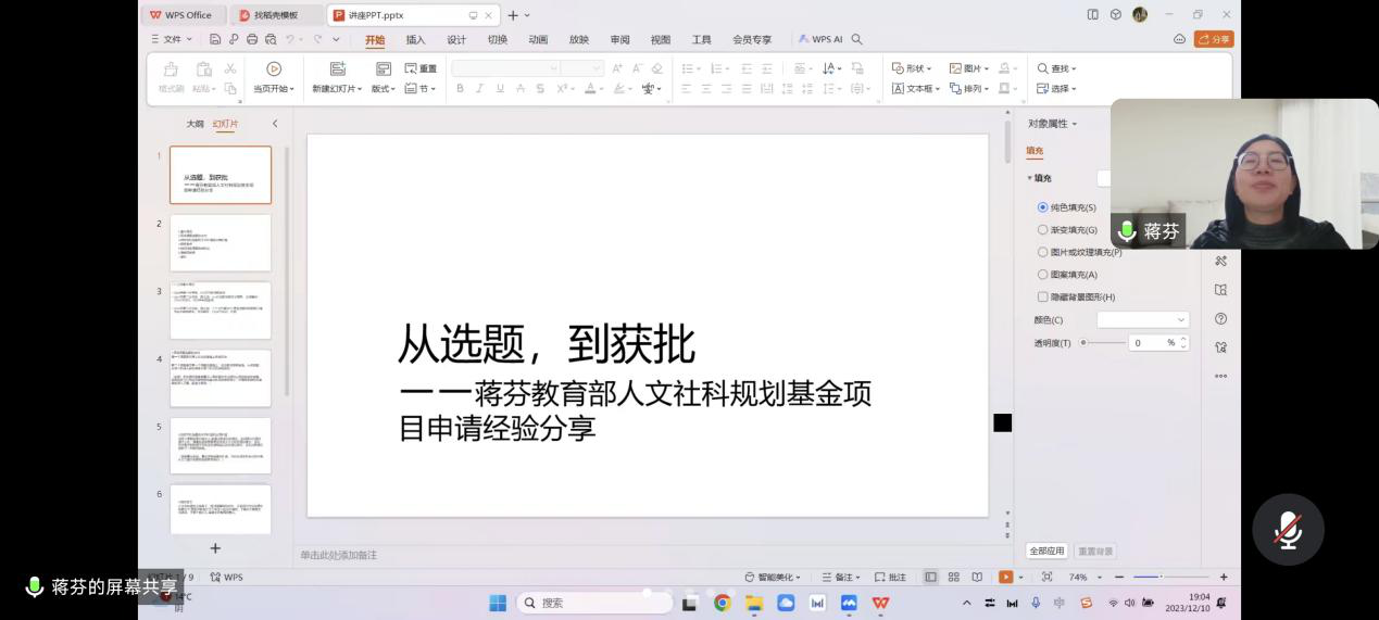 本次讲座主题为“从选题到获批——蒋芬教育部人文社科规划基金项目申请经验分享”。在讲座中,蒋副经理以其独特的视角和宝贵的经验,向在场的老师们分享了申请教育部人文社科规划基金项目的全过程。她从选题的由来、选题的学术价值和应用价值,以及如何确定研究重点和创新点等方面进行了深入浅出的讲解。